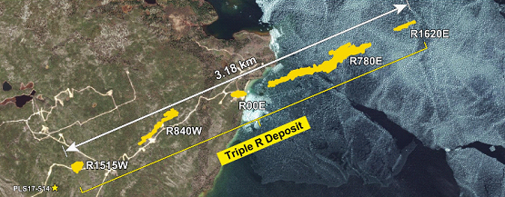 PLS項(xiàng)目目前已發(fā)現(xiàn)的礦體呈東西走向,從西到東依次為R1515W,R840W, R00E,R780E 和R1620E,長度約3.17 公里,組成加拿大薩斯喀徹溫省已發(fā)現(xiàn)的最長的高品位鈾礦成礦帶,亦是全球最大的待開發(fā)高品位鈾礦項(xiàng)目之一。當(dāng)前勘探結(jié)果表明,PLS項(xiàng)目未來仍具備較高的資源增長潛力前景。