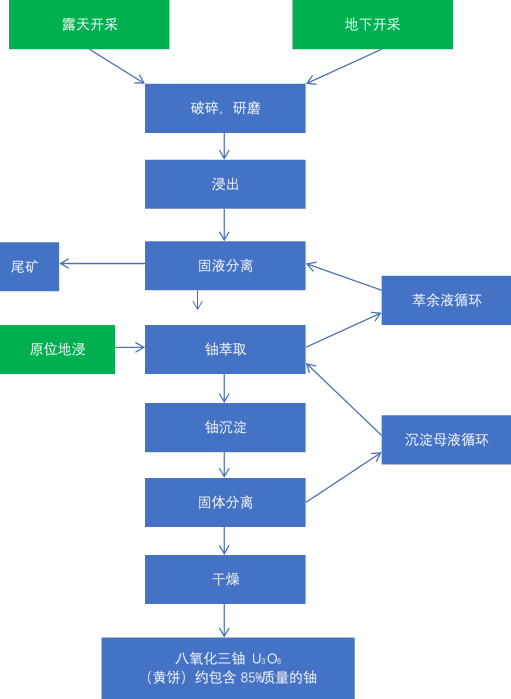 世界主要鈾礦的開采方式包括三種:原位地浸開采,露天開采及地下開采。世界約48%的天然鈾通過原位地浸開采生產出來,46%來自于常規開采方法(露天開采及地下開采)生產出來,6%作為其他礦產品副產品采出。 鈾礦開采生產工藝示意圖 2017年世界各國產鈾比例(總產量為59,531噸鈾) 原位地浸開采 原地浸出采鈾是將溶浸液通過注液鉆孔注入到可滲透的含礦含水層,使溶浸液在滲透過程中與鈾接觸并進行溶解反應,生成含鈾溶液,并從抽液孔被抽至地表,輸送到車間加工處理后獲得鈾產品的流程。 ? 適用賦存于含水及可滲透砂巖中鈾礦物開采。 ? 圈定鈾礦的邊界品位為0.001%。 ? 根據浸出機理的不同,分為酸法和堿法開采。 開采的適用條件: (1)含礦巖性應為具有滲透性的砂巖、砂礫巖。礦體賦存于地下水位以下的含礦含水層中。充水性和滲透性是地浸是否可行的決定性因素。 (2)礦體產狀平緩(傾角一般小于10度),礦體頂底板應是良好封閉的不透水層。 (3)礦床平米鈾量應在最低經濟指標之上,含礦含水層中碳酸鹽含量>2%則不宜用酸法浸出。圍巖以長石石英質或石英質砂巖最宜。 (4)按照目前鈾價,開采礦體最大埋藏深度不宜超過400-600m。 浸出機理 酸法 主要使用硫酸作為溶浸劑,礦石中鈾隨溶浸液pH值的下降2以下后從沉淀態變為溶解態,生成硫酸鈾酰溶液。含礦含水層中碳酸鹽含>2%則不適用。 堿法 主要使用碳酸氫銨作為溶浸劑,礦石中鈾隨溶浸液pH值上升到9以上后礦石中的6價鈾與碳酸鹽中的碳酸根(CO32-)絡合,生成碳酸鈾酰溶液。產品液鈾含量低,銨鹽也造成地下水污染。 二氧化碳+氧氣 原理是氧氣氧化礦石,在地下水中加入二氧化碳后,形成的碳酸氫根(HCO3-)離子與礦層中的鈾發生反應,使鈾溶解在溶液中,也屬于堿法浸出分類。 細菌浸出 主要選用氧化鐵硫桿菌,在浸出鈾的過程中,主要起間接催化作用,能促進黃鐵礦和硫酸亞鐵的氧化,促進6價鈾生成??山档退岷?。需配合酸法使用,但并非一種獨立的浸出方法。 地浸的主要優點: (1)開采方法安全簡單、工藝流程短。采礦階段無需搬運、破碎礦石,水冶階段無需磨礦和固液分離,縮短了采冶工藝流程,直接生產成本低。 (2)礦山建設周期短、基建投資少,勞動強度低、自動化程度高,固定資產折舊低。 (3)環境污染小。一是抽注基本平衡,地浸溶液是在閉路管道內循環使用,其廢水排放量顯著減少;二是放射性粉塵污染得到徹底改善;三是尾渣和廢氣的污染減到了最低程度。 露天開采即一個移走礦體上的覆蓋物,從敞露地表的采礦場采出鈾礦物的過程。主要適用于主礦體埋藏較淺的鈾礦床開采。 主要優點包括: 1. 基建周期短。2-4年/大型 6-8月/小型。 2、開采空間大,勞動生產率高。比地下開采高2-10倍。 3、礦石損失、貧化率較小。損失率3%-5%貧化率5%-8%。 4、開采成本低,勞動條件好,生產安全。 主要缺點: 1、開采受到氣候影響大。 2、基建設備投資大。 3、礦山占地多,對地表環境破壞大。 地下開采即通過開掘井巷工程從地下礦床的礦塊里采出礦石的過程,通過礦床開拓、礦塊的采準、切割和回采4 個步驟實現。主要適用于埋藏較深及地表不允許露天開采的鈾礦床。以地壓管理方法為依據,分為空場采礦法充填采礦法、崩落采礦法三大類。