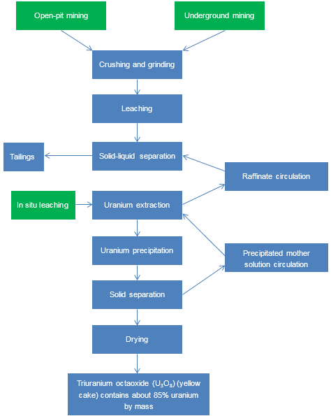 There are three kinds of ways to explore the main uranium ore: In-situ leach mining, open-pit mining and underground mining. There is about 48% of natural uranium produced by virtue of in-situ leach mining in the world, 46% from the conventional mining method (open-pit mining and underground mining), and 6% extracted as other minerals and by-products.